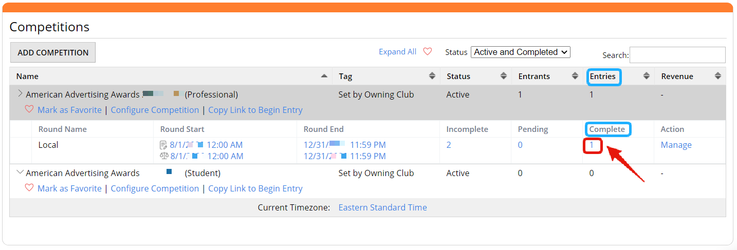 Under the "Entries" and "Complete" headers, click on the number of completed entries to be taken to a list of them