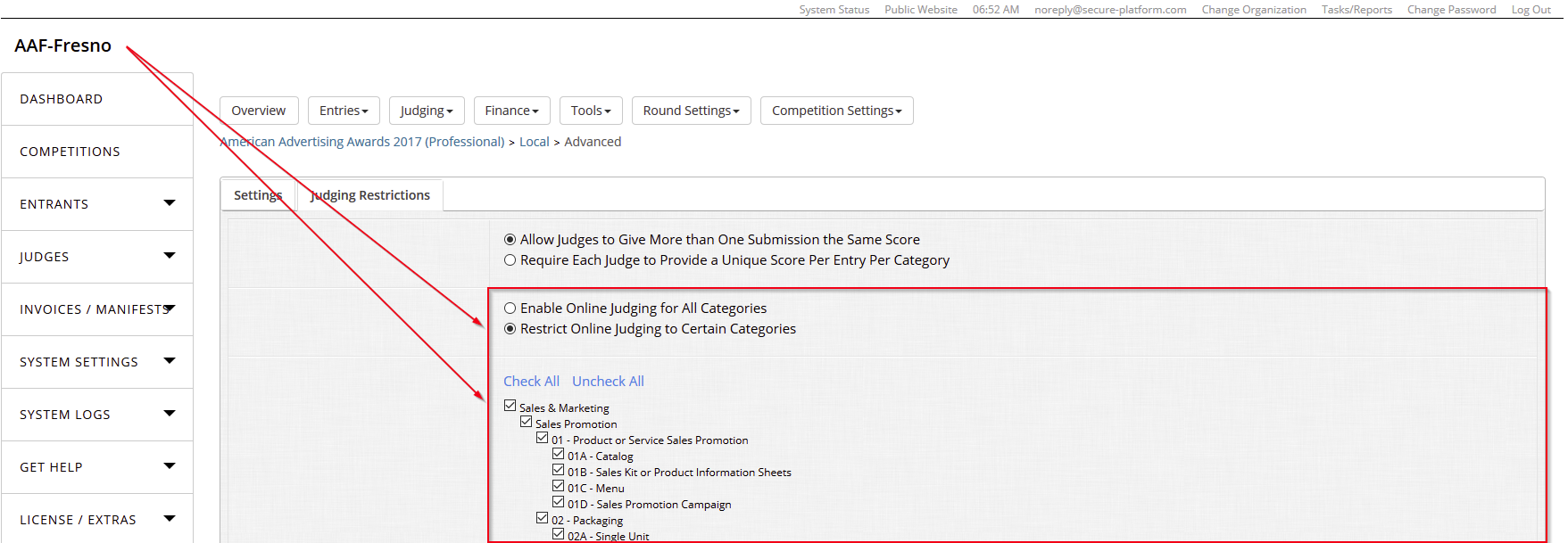 Click the "Restrict Online Judging to Certain Categories" radio button to enable the option and view the categories
