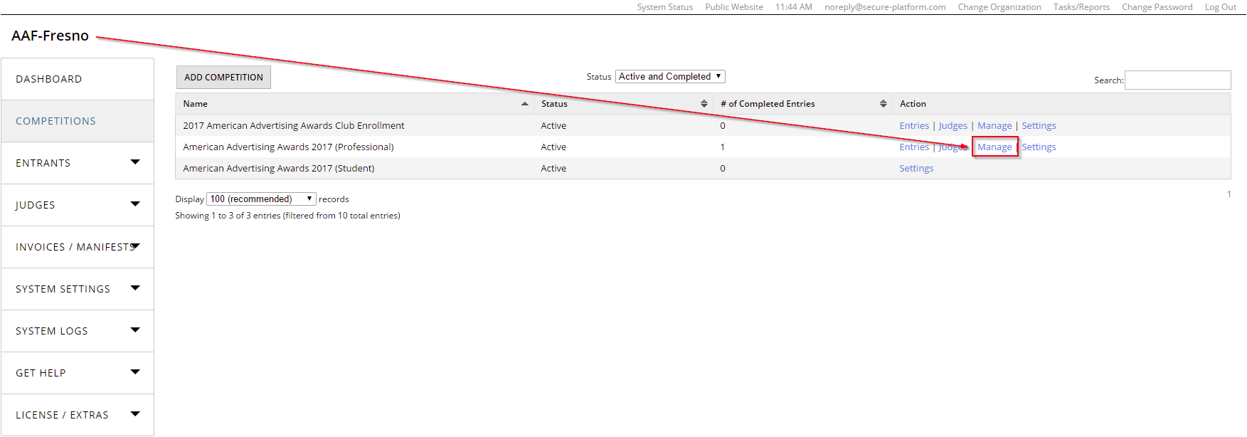 After clicking on the Competitions tab, look to the right to find and click on "Manage"
