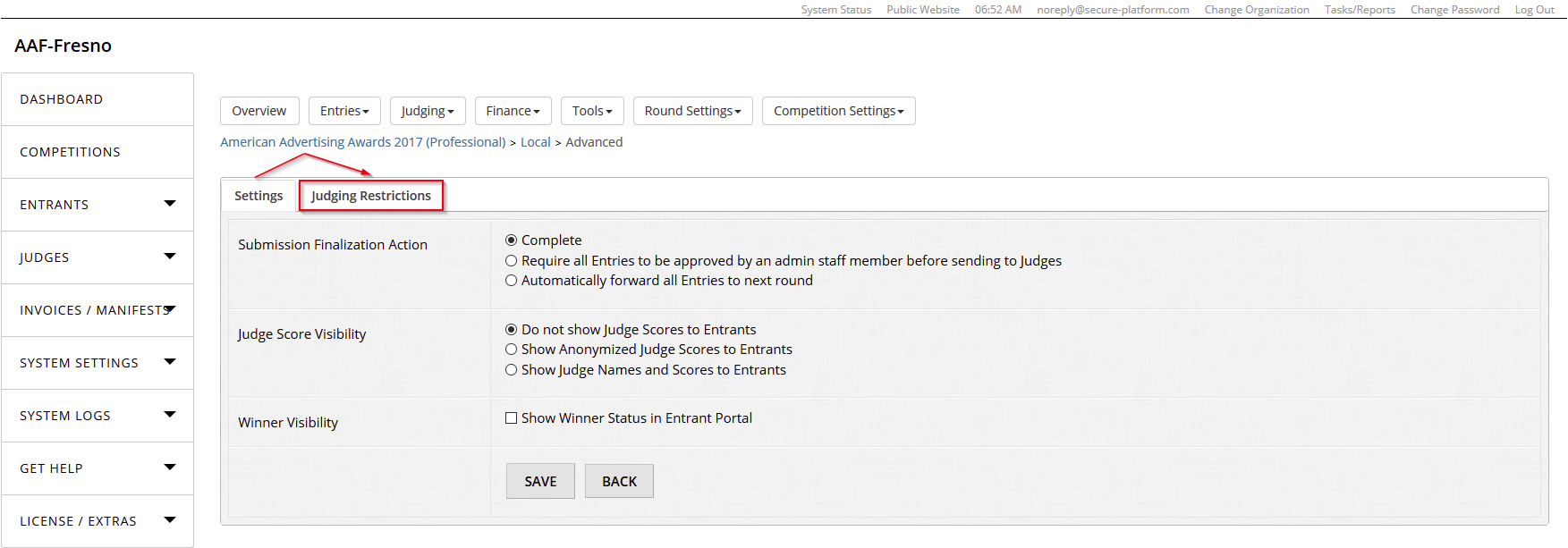 Click on the "Judging Restrictions" tab