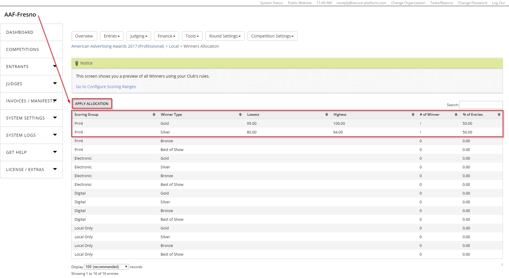 - On the opened page you will see how many winners are assigned to each scoring group you have.