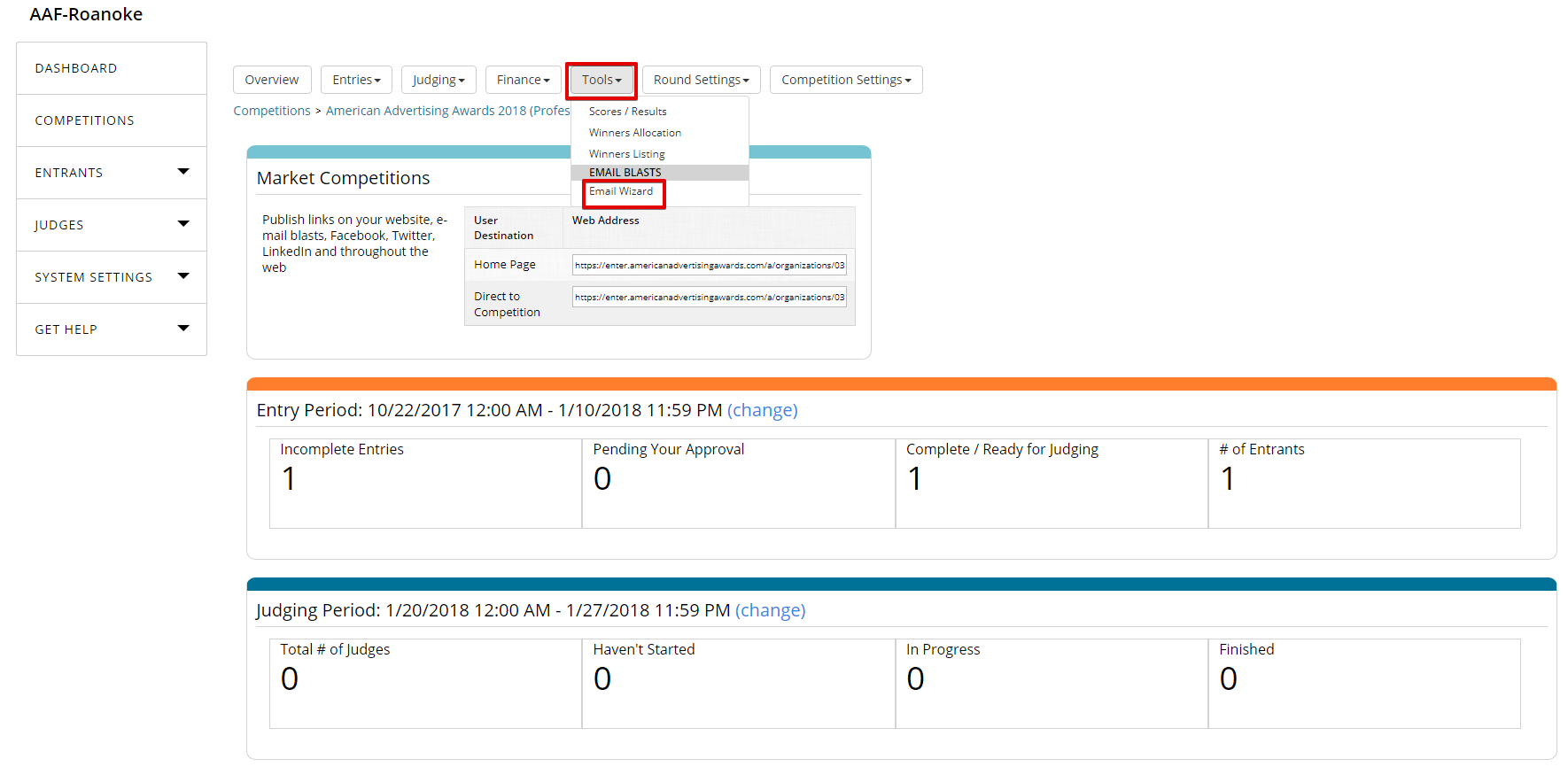You may need to email judges during you competition, to inform them judging for a round has started, or to remind them to finish judging entries. To see how follow these steps.