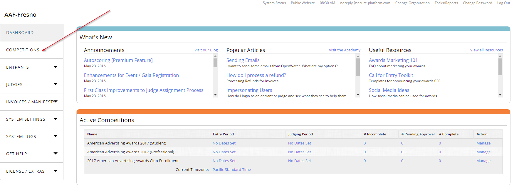 - From your OpenWater Dashboard, find and click the Competitions tab on the left side navigation bar