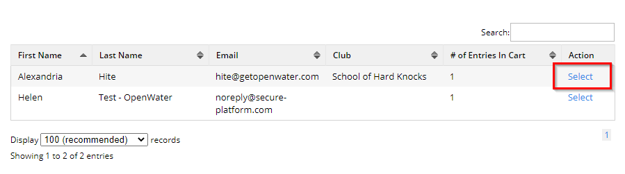 From the list, locate the shopping cart you wish to finalize for the entrant, and click Select from the Action column.