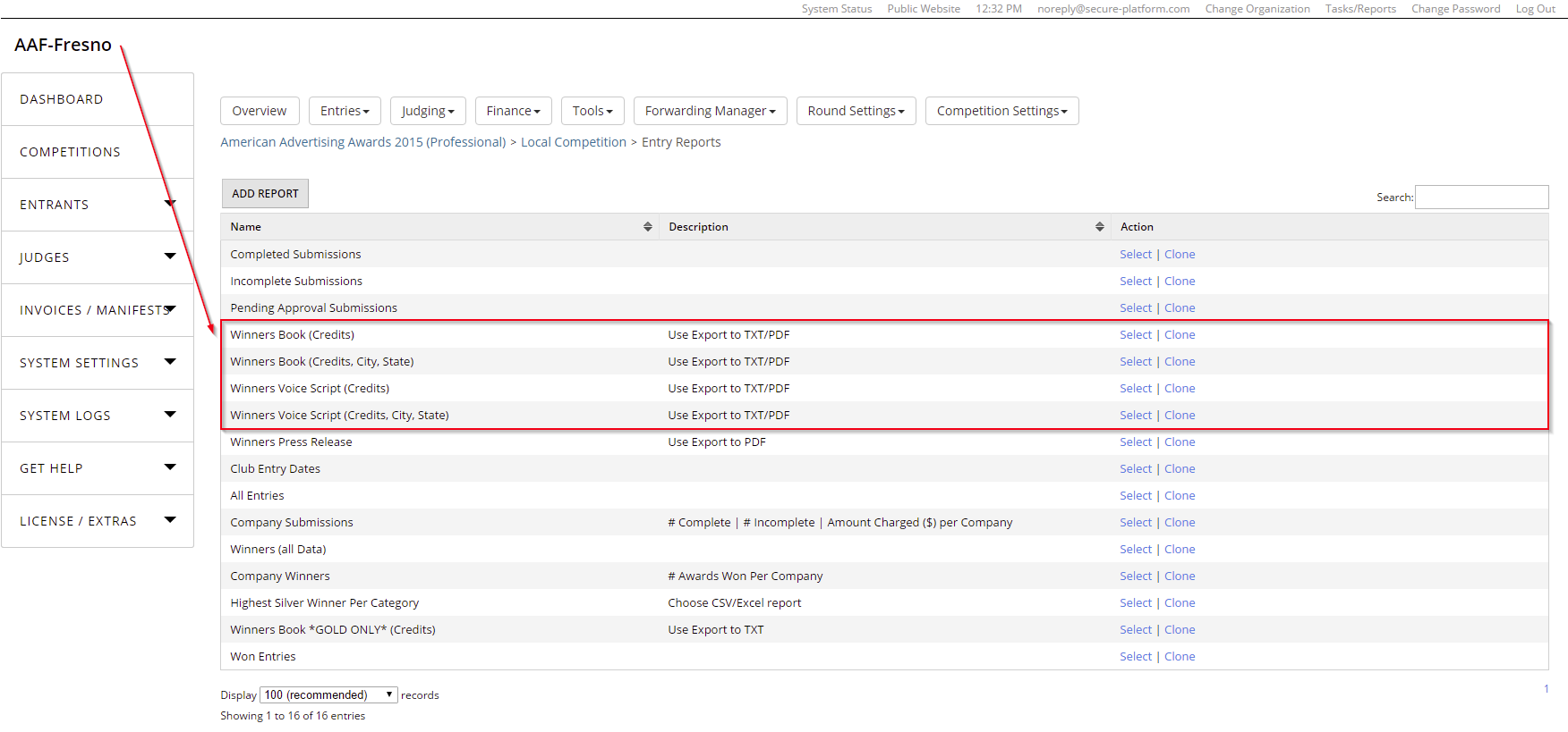 - Choose one the "Winners Voice Script" reports