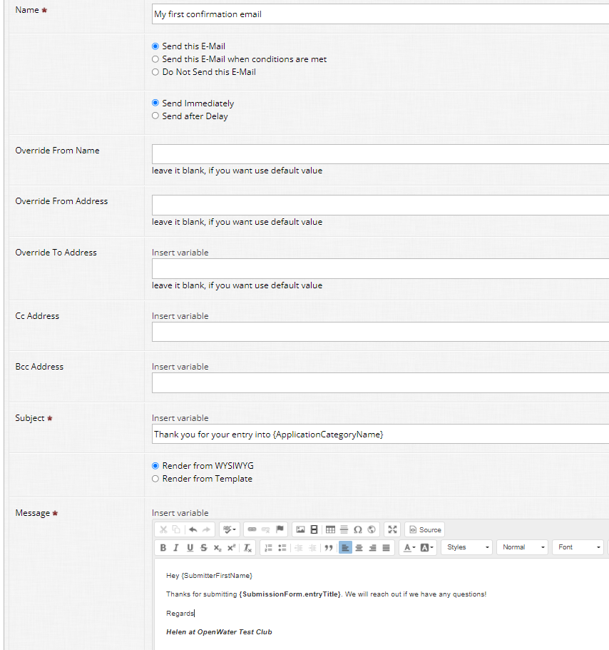 Override To Address: By default (if left blank), the email will be sent to the individual who submitted the entry, using the email address provided when they created their OpenWater account. This field is usually only used for specific situations/workarounds. We recommend leaving this blank.