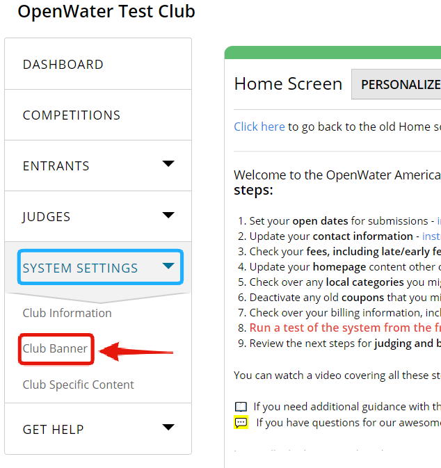 - From Dashboard, open the System Settings drop-down on the left and select Club Banner item.